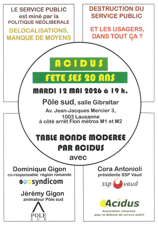 A l’occasion de son anniversaire, l’association Acidus animera une table ronde ronde sur les services publics. Au menu, délocalisation, mesures d’austérité et effets concrets sur les conditions de travail et les publics précaires.