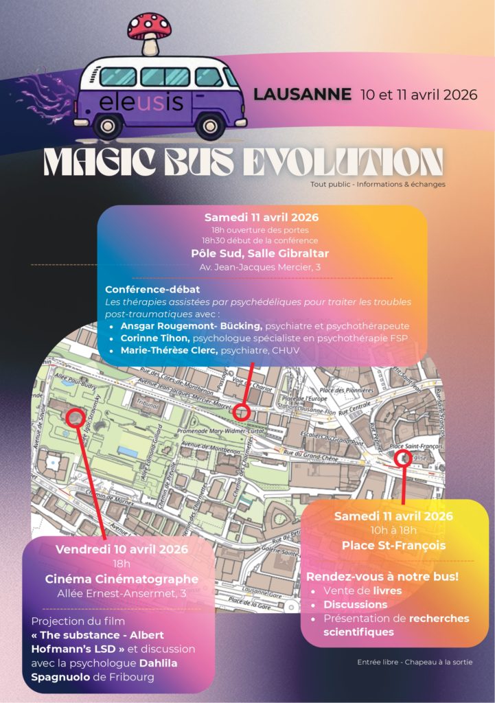 Magic Bus Evolution – Better Together est un projet éducatif et de dialogue mené par l’association psychédélique Suisse, Eleusis. Du 8 au 19 avril 2026, un bus d’éducation conscient et spécialement conçu pour le voyage parcourra la Suisse afin de sensibiliser le public aux thèmes de la recherche sur les psychédéliques, de la réduction des risques et de l’intégration sociale. À chaque étape, un programme spécifique sera proposé sur le thème de la recherche sur les psychédéliques, de la réduction des risques et de l’intégration sociale. Le voyage s’achèvera le 19 avril 2026 par une célébration à Bâle, lieu historique du “Bicycle Day”, jour de la découverte du LSD par le chimiste Albert Hofmann. Inspiré par le souhait d’Hofmann de créer un « Eleusis contemporain », ce projet allie science, histoire culturelle, éducation psychosociale et communauté. L’objectif est de susciter un débat public compétent, objectif et éclairé sur les psychédéliques, loin du battage médiatique et de la stigmatisation.