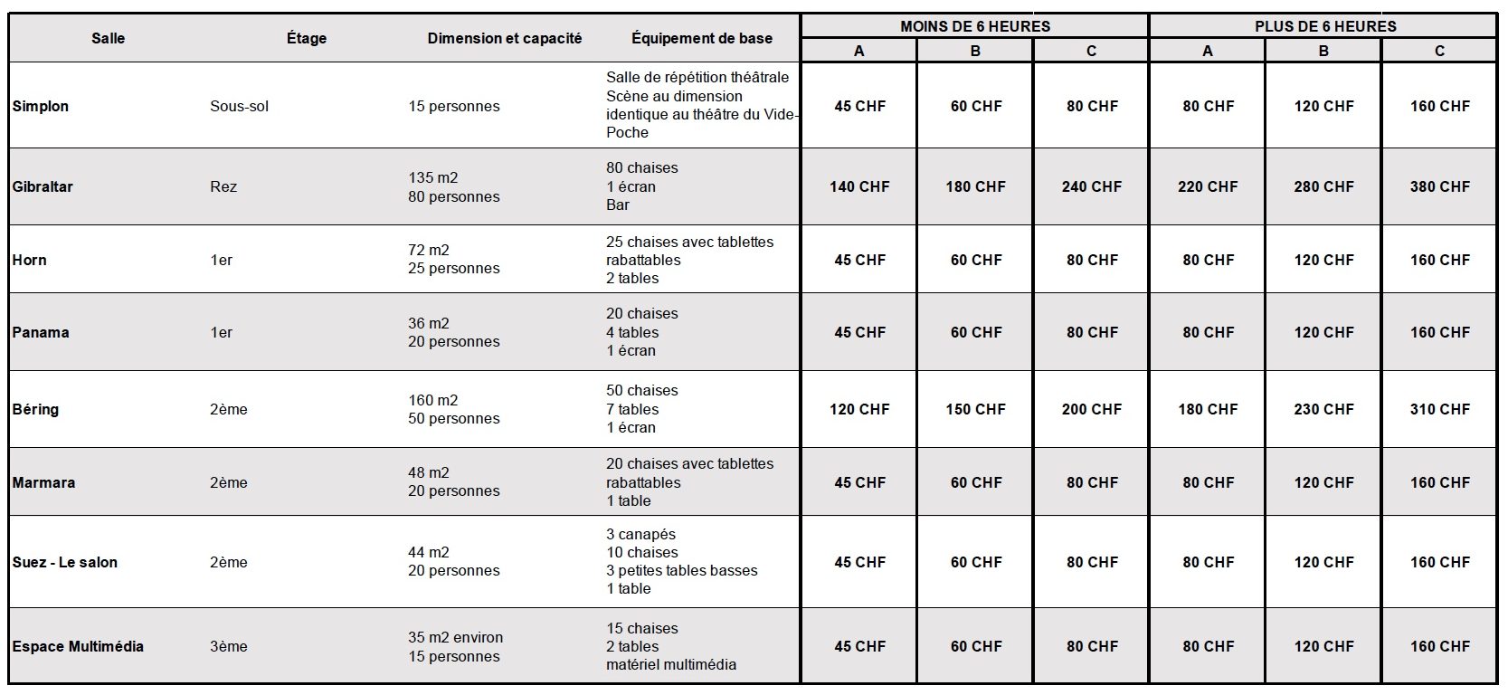 À partir du 1ᵉʳ janvier 2026, nos tarifs de location de salles évolueront afin de mieux refléter la hausse de nos coûts liés au ménage et à l’intendance, et pour instaurer une tarification plus équitable tenant compte du budget et de la capacité financière des différentes organisations. Nous restons cependant pleinement engagés à proposer des prix accessibles : si ces nouveaux tarifs constituent un frein à votre projet, n’hésitez pas à nous contacter afin que nous puissions étudier ensemble une solution adaptée.
